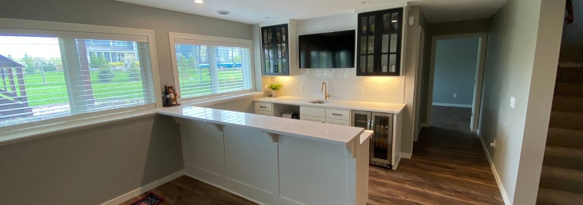 finished basement with a full kitchen with white cabinets and a white countertop - South Metro Custom Remodeling custom basement remodelBeyond Functionality: Creating a Livable Space in Your Custom Basement Remodel