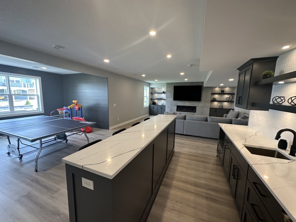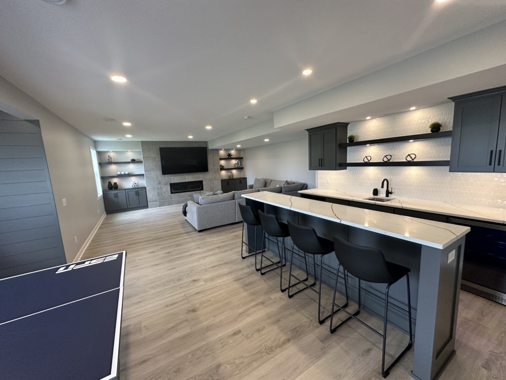 We offer a full range of basement remodeling services, including custom wet bars, cozy fireplaces, tile showers, custom cabinetry, and luxury vinyl plank flooring.